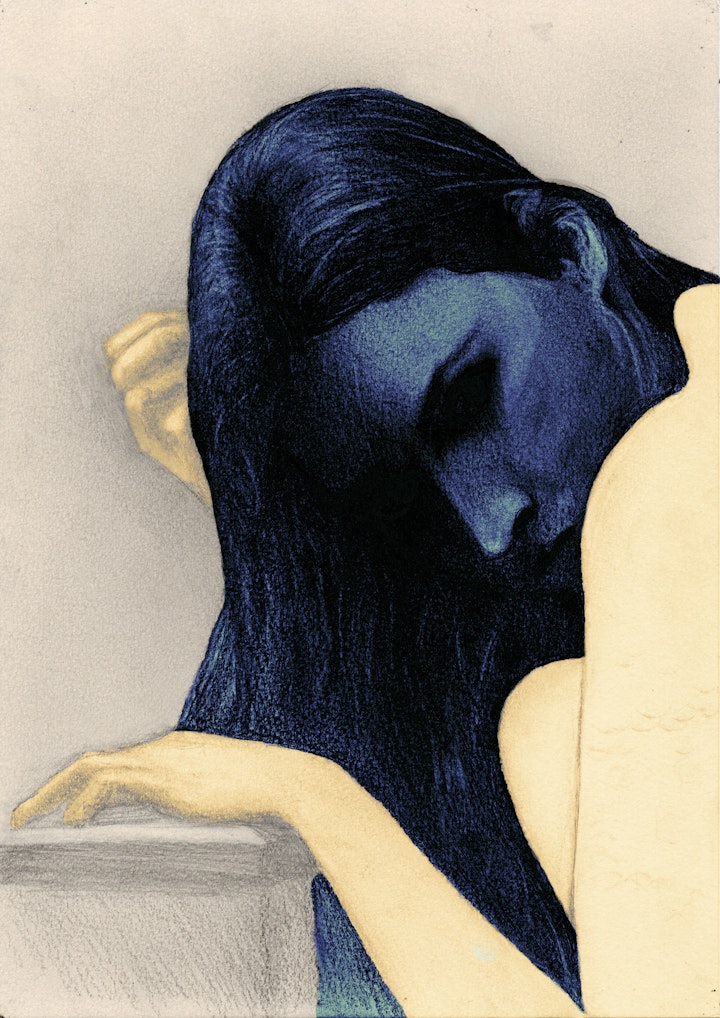 BLUEBLUE portrays a young woman in deep reflection, her face illuminated by soft light amidst shadowy blue tones, symbolizing nostalgia and introspection. Inspired by Joni Mitchell’s iconic song "Blue," the artwork captures a profound sense of emotional weight and lingering memories from the past. The deep, enveloping blue suggests a state of longing and vulnerability, echoing the song's introspective themes. The contrast between her soft, ivory skin and the intense blue shadows highlights a duality between light and darkness, representing the bittersweet nature of emotions tied to memory and self-reflection. Her downward gaze and relaxed hand posture convey an intimate moment of solitude, inviting viewers to share in this private contemplation. Through color, contrast, and minimalist composition, BLUE evokes a delicate balance between melancholy and warmth, creating a poignant visual reflection of Joni Mitchell’s timeless lyrics.